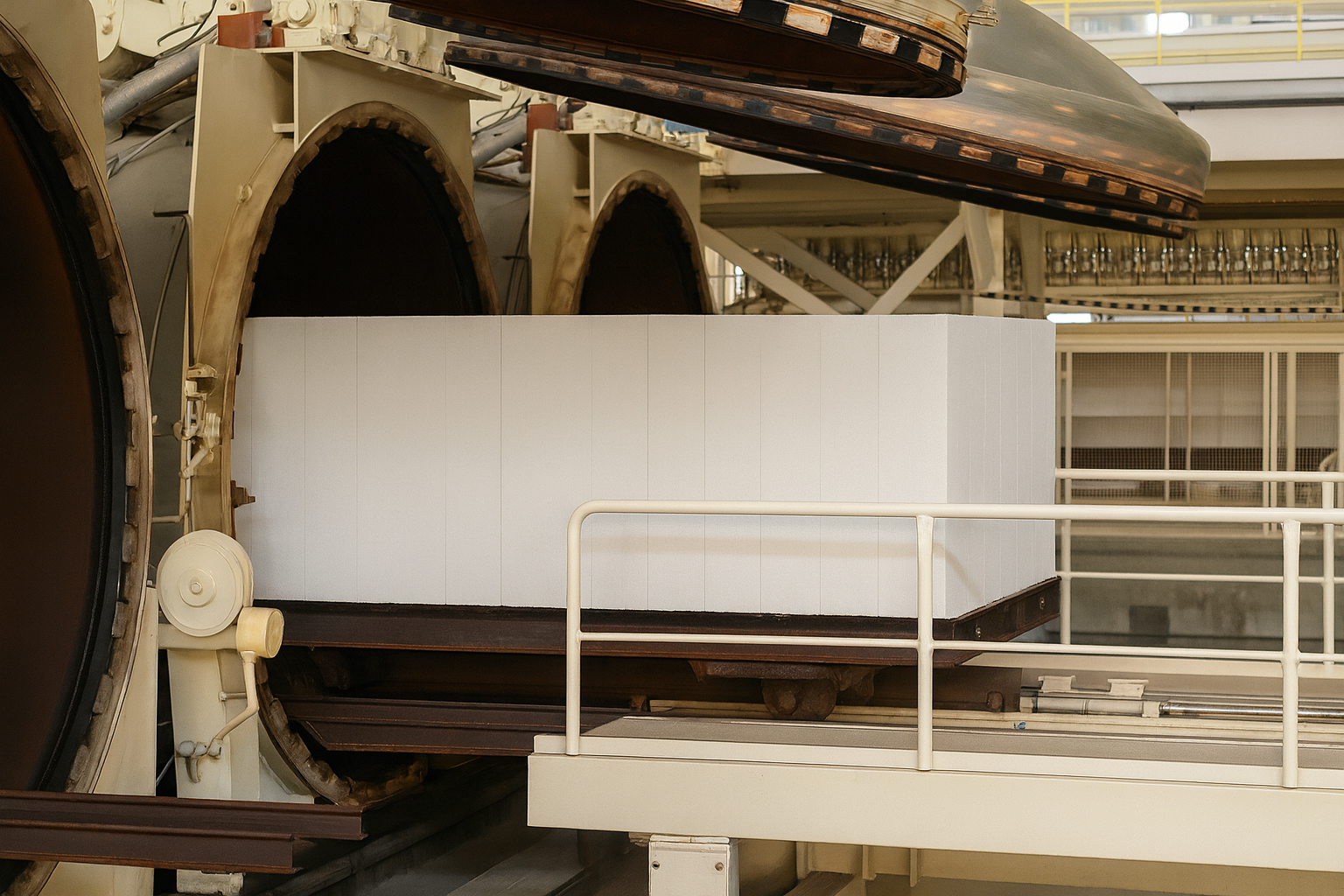 Перед помещением в камеры подготовленный массив проходит разделение, благодаря чему на готовых изделиях отсутствуют сколы и трещины. Газоблок равномерно пропаривается со всех сторон, за счет чего удается достичь однородной структуры и высокой прочности.